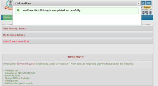 Step 7: On successful linking of your Aadhaar with PAN a message will be displayed on your monitor screen.