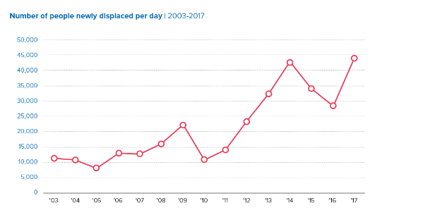 The table above shows that the past decade has seen a considerate increase in the forcibly displaced population. The subsequent increase in this number from 42.7 million to 68.5 million in 2017 is observed after the conflict in the Syrian Arab Republic, Myanmar, South Sudan, Ukraine and Yemen.