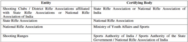 - Sports Authority of India, National Rifle Association of India, State Sports Authority and State Rifle Association have ranges affiliated to them. Therefore, these bodies are to inspect the ranges affiliated to them, at regular intervals to ensure strict adherence of safety standards and norms laid down for shooting ranges.