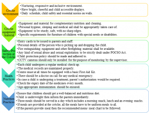 - The guidelines also provide norms and standards to be followed in a crèche. Some are mentioned below in the form of a chart: