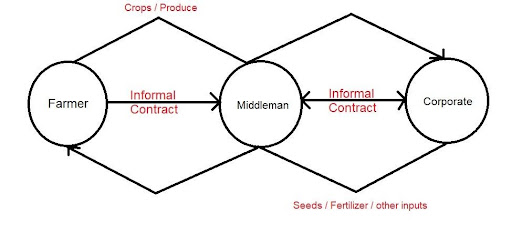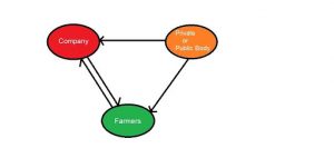 This is the combination of both central and informal models and can well function if the incentives and control mechanisms are adequate. Though, there can be a negative impact too, companies may lose control over the production process which may impact the regular supply and quality of the product and the chance of losing the advance made to the farmers. Also, the farmer may face harm from unsolicited intermediaries, or there is a risk of price distortion or loss of income.