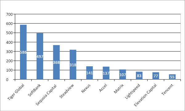 As per the data provided by IVCA report, Tiger Global leads in deal value and Sequoia Capital leads in terms of volume.