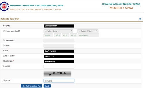 - Upon feeding the UAN no., name, DOB and the Captcha click the ‘Get Authorization Pin’, the below screen will come up.