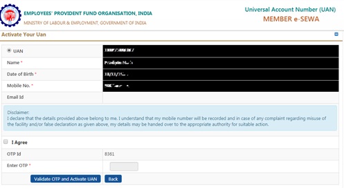 - Please, to enter the OTP no. which will come in the mobile no. provided. So make sure that the mobile is kept beside while doing this UAN activation. Click the ‘I agree’ box and put the OTP in the box provided.