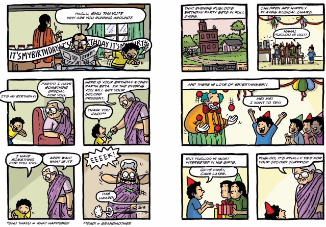 “Ten-year-old Pugloo runs around the house, announcing “It’s my birthday.” At his party later in the day, his grandmother hands him a gift from his late grandfather. He tears open the big package but is disappointed at the sight of a book. The book, on Indian laws and rights, eventually becomes a fun learning tool for the boy. Pugloo is the central character of Lawtoons, a comic book developed by Ahmedabad-based sisters Kanan and Kelly Dhru launched on November 23rd, 2017 at the Oxford Bookstore, Connaught Place, New Delhi.
