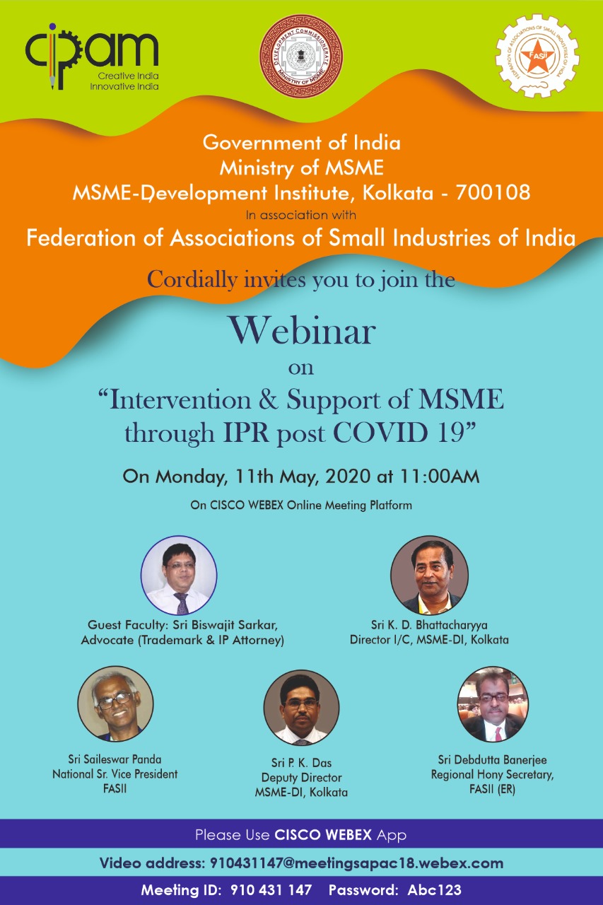 Besides, the various speakers from MSME Department, Govt.of India and the Federation of Associations of Small Industries of India, the eminent IP Attorney Biswajit Sarkar who is widely regarded in the industry circles will speak for the program. He is having wide experience of handling complicated matters in IPR and successfully completed two world-renowned cases, such as registration of a particular address as trademark of 6 Ballygunge Place and creating copyright protection for Missionaries of Charity founded by Mother Teresa. Mr.Biswajit Sarkar is empanelled with different Embassies, Consulates and Chambers of Commerce.